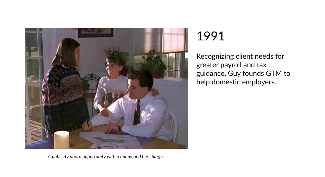 Recognizing client needs for greater payroll and tax guidance, Guy founds GTM to help domestic employers.