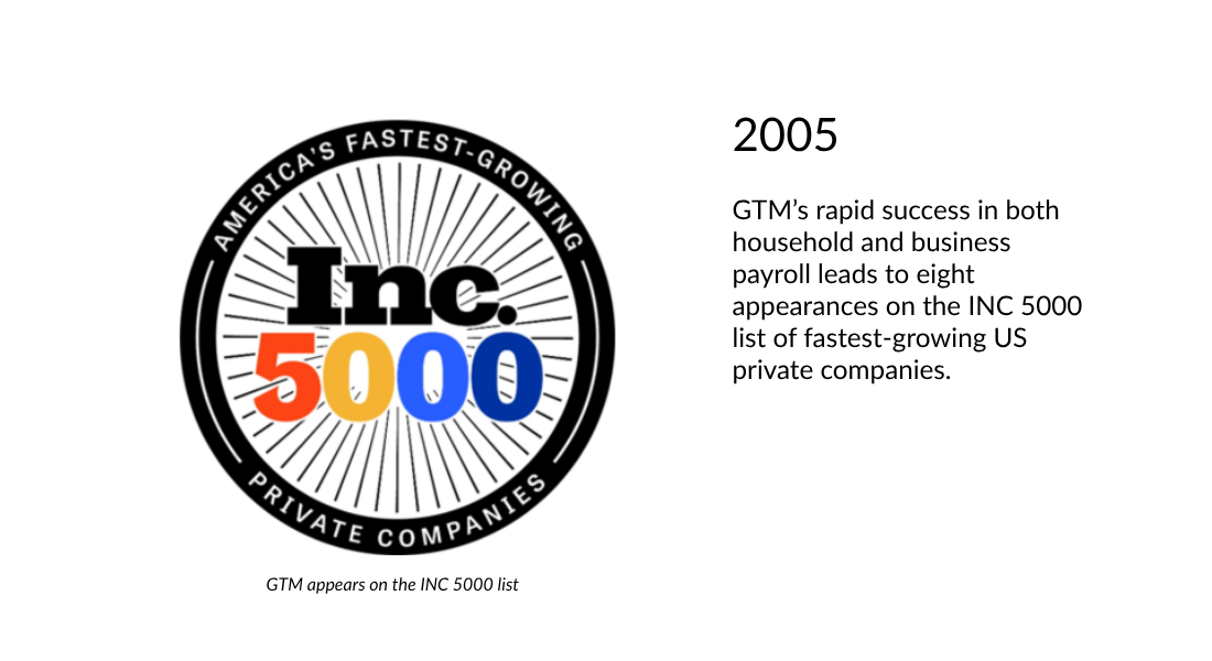 GTM’s rapid success in both household and business payroll leads to eight appearances on the INC 5000 list of fastest-growing US private companies.