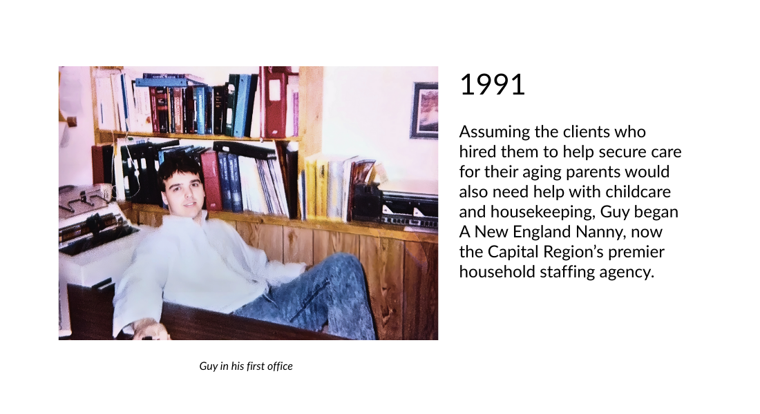 Assuming the clients who hired them to help secure care for their aging parents would also need help with childcare and housekeeping, Guy began A New England Nanny, now the Capital Region’s premier household staffing agency.