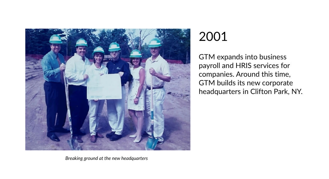 GTM expands into business payroll and HRIS services for companies. Around this time, GTM builds its new corporate headquarters in Clifton Park, NY.