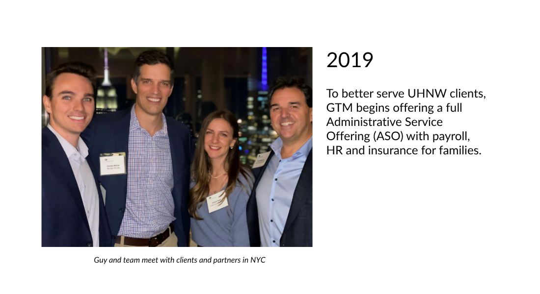 To better serve UHNW clients, GTM begins offering a full Administrative Service Offering (ASO) with payroll, HR and insurance for families.