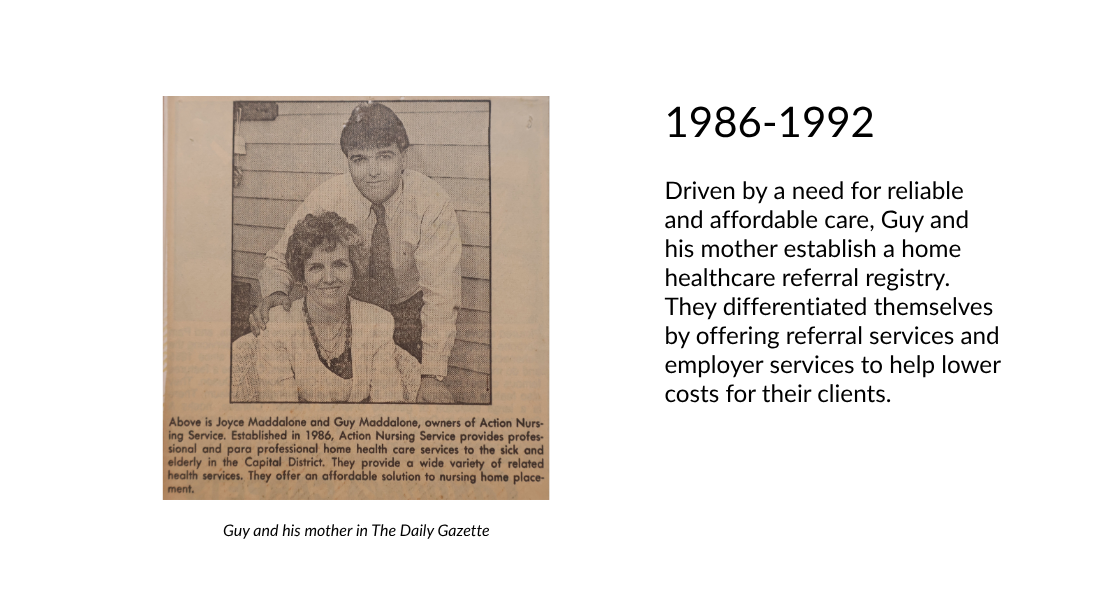 Driven by a need for reliable and affordable care, Guy and his mother establish a home healthcare referral registry. They differentiated themselves by offering referral services and employer services to help lower costs for their clients.